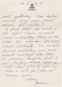 Date written: 1943-04-11 From: James Hennessy To: Beatrice Hennessy Address: Moncton, NB Comments: Says he is on a new shift, works until 4 am in the morning, sleeps until 1 pm. Asks about Sidney's mother, she is very ill.Says he enjoys the night classes better because they are about electricity and he's learning a lot about riveting. Says he can't believe a week has passed already. Envelope: No